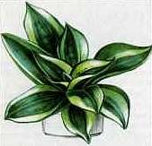 Сансевиерия (Sansevieriaa)Вечнозеленое растение семейства лилейных, родом из саванн Южной Африки и тропической Азии. Из нескольких десятков видов сансевиерии в комнатном разведении цветоводы-любители используют один - сансевиерию трехполосую (Sansevieria trifasciata). Это популярное комнатное растение, известное своей долговечностью и выносливостью. У него ползучее корневище с розетками из 5-6 мечевидных жестких кожистых прямостоячих листьев длиной до 1 м и шириной до 7 см, заостренных на концах. Окраска листьев очень декоративна: на темно-зеленом фоне проходят поперечные полосы более светлой, серовато-зеленой окраски. У молодых листьев окраска ярче. У этого вида сансевиерии есть разновидности, окаймленные золотисто-желтой полосой, с белыми, желтыми, кремовыми полосами на листьях. Существуют также разнообразные низкорослые формы, образующие невысокую компактную розетку (15-20 см в высоту) с темно-зелеными широкими короткими листьями, покрытыми желтыми полосами и окаймленными широкой желтой полосой; с серебристыми листьями, усеянными темно-зелеными крапинками.